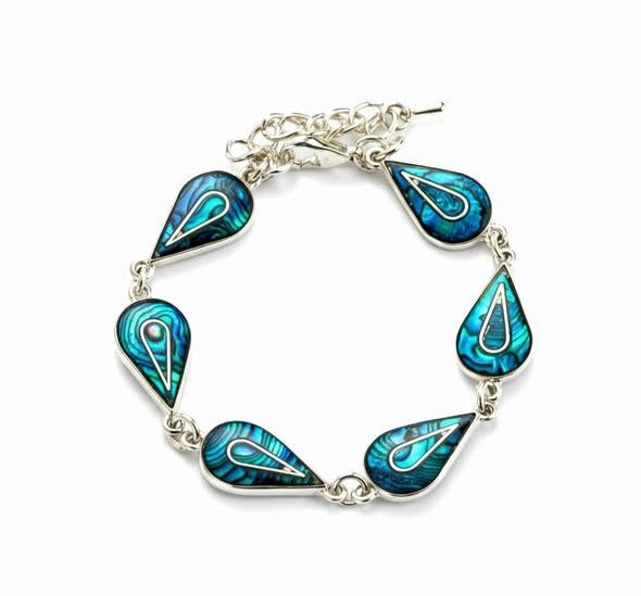 Náramek s paua mušlí zasazený do bílého kovu, neobsahujícího nikl. PAUA je druhem mušle abalone (Haliotis Iris) z moří Nového Zélandu. Jeho původní obyvatelé, Maorové, ji nazývají „Paua Te Koha a Tangaroa“ – Dar mořského boha. Maorská legenda praví, že paua je zvláštní darem od Tangaroa, boha moře. Nachází se jen na pobřežích Nového Zélandu, kde žije na skalnatém pobřeží, nejlepší mušle paua pocházejí z jižní části vod okolo NZ. Žije v hloubce cca 10 metrů zavěšena na skalnatých výčnělcích. Paua je nejbarevnější mušlí z druhu abalone, žádná jiná mušle na světě nemá tak zářivé a plné barvy. Při natáčení ve světle pod různými úhly mění barvy a proměňuje je v duhu. Svou měňavou hrou barev je tak podobná krystalům opálu. Paua byla tradičně užívána Maory při tvorbě jejich uměleckých řezeb, zejména očí jejich soch. Paua má velký význam v maorských tradicích, je nezbytná pro svatební obřady a jiné oslavy. Dnes se používá paua pro výrobu šperků a její střípky pro výrobu bižuterie.
