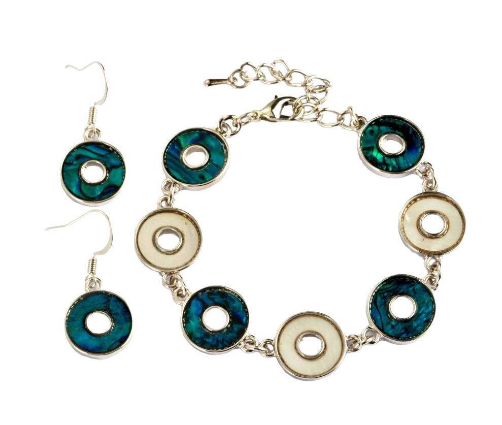 Náramek a náušnice z mušle Paua modro zelenkavé barvy, která hází nádherné odlesky, tvoří perfektní kombinaci. Při natáčení ve světle pod různými úhly mění barvy a proměňuje je v duhu.