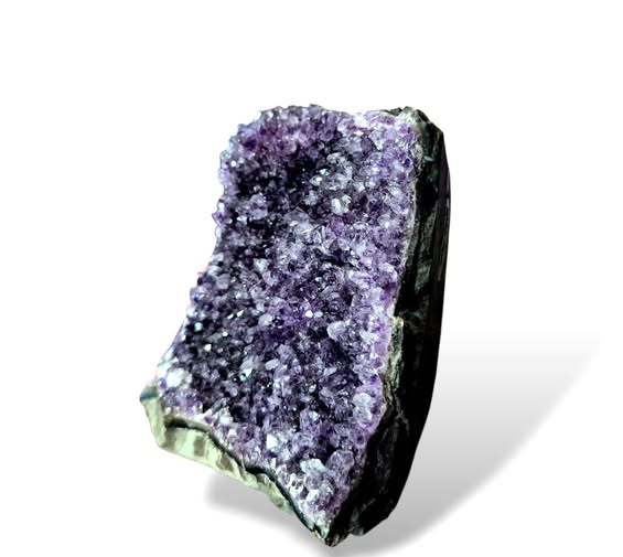 Drúzy jsou srůsty několika krystalů na společném podkladu. Tyto ametystové drúzy mají plochou řezanou základnu; někdy bývají seříznuté i boční strany, aby produkt působil esteticky. Zadní část zůstává v přírodní formě. Tyto drúzy pocházejí z oblasti Artigas v Uruguai, vyznačují se tedy drobnými krystalky temně fialové barvy.