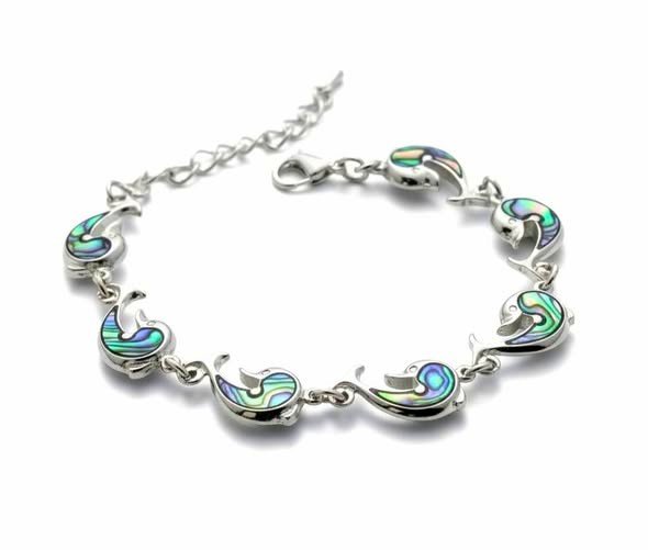 Náramek s paua mušlí zasazený do bílého kovu, neobsahujícího nikl. PAUA je druhem mušle abalone (Haliotis Iris) z moří Nového Zélandu. Jeho původní obyvatelé, Maorové, ji nazývají „Paua Te Koha a Tangaroa“ – Dar mořského boha. Maorská legenda praví, že paua je zvláštní darem od Tangaroa, boha moře. Nachází se jen na pobřežích Nového Zélandu, kde žije na skalnatém pobřeží, nejlepší mušle paua pocházejí z jižní části vod okolo NZ. Žije v hloubce cca 10 metrů zavěšena na skalnatých výčnělcích. Paua je nejbarevnější mušlí z druhu abalone, žádná jiná mušle na světě nemá tak zářivé a plné barvy. Při natáčení ve světle pod různými úhly mění barvy a proměňuje je v duhu. Svou měňavou hrou barev je tak podobná krystalům opálu. Paua byla tradičně užívána Maory při tvorbě jejich uměleckých řezeb, zejména očí jejich soch. Paua má velký význam v maorských tradicích, je nezbytná pro svatební obřady a jiné oslavy. Dnes se používá paua pro výrobu šperků a její střípky pro výrobu bižuterie.